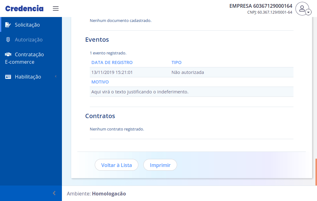 Na seção "Eventos" verifique a data, o tipo e o motivo do indeferimento.